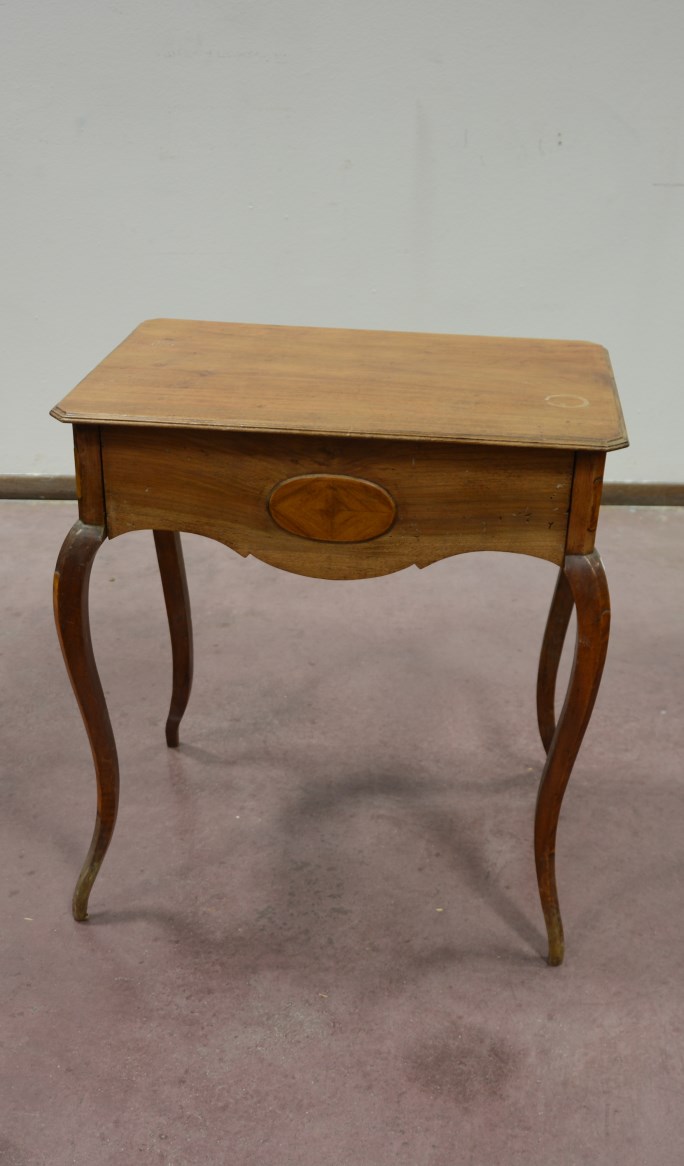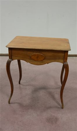 Tavolino da centro ad un cassetto sottopiano decorato a specchiature ovoidali. Gambe mosse (cm 64x70x45) (difetti)