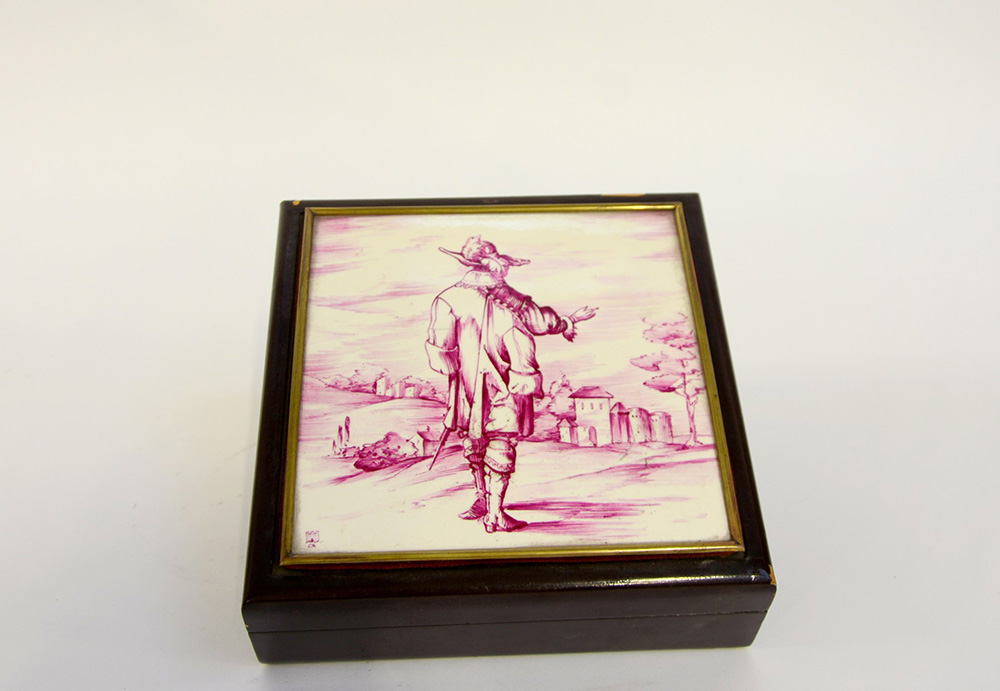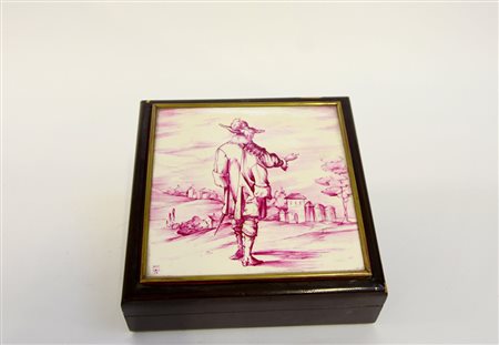 Gabriella Locatelli. Scatola in lacca decorata sul coperchio in monocromia con cavaliere in un paesaggio (difetti)