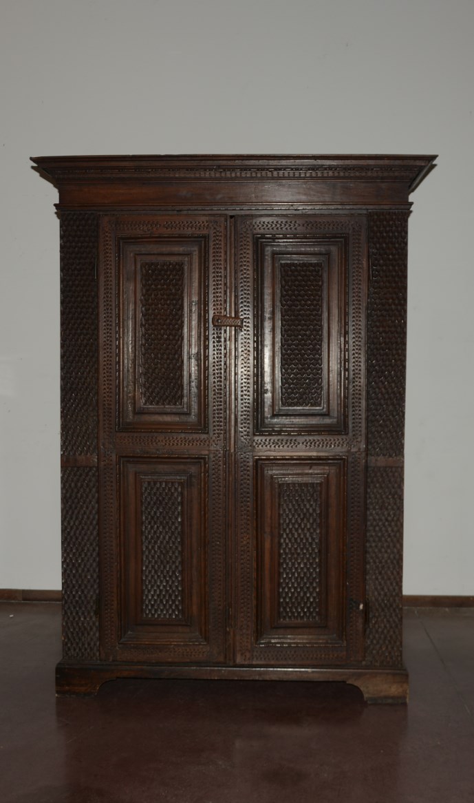 Antico armadio a tre ante con fronte intagliato a motivo unghiato. Cappello...