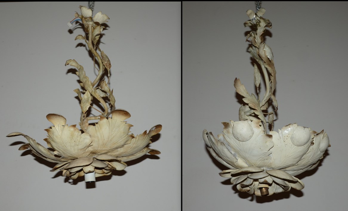 Coppia di lampadari in ferro battuto e decorato a foglie