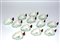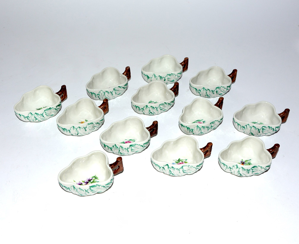 Gruppo di dodici tazzine a forma di foglia stilizzata in porcellana policroma (difetti)