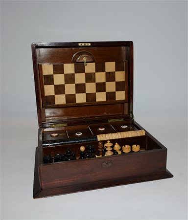 Scatola da gioco con scacchiera, scacchi e porta carte decorati con semi e...