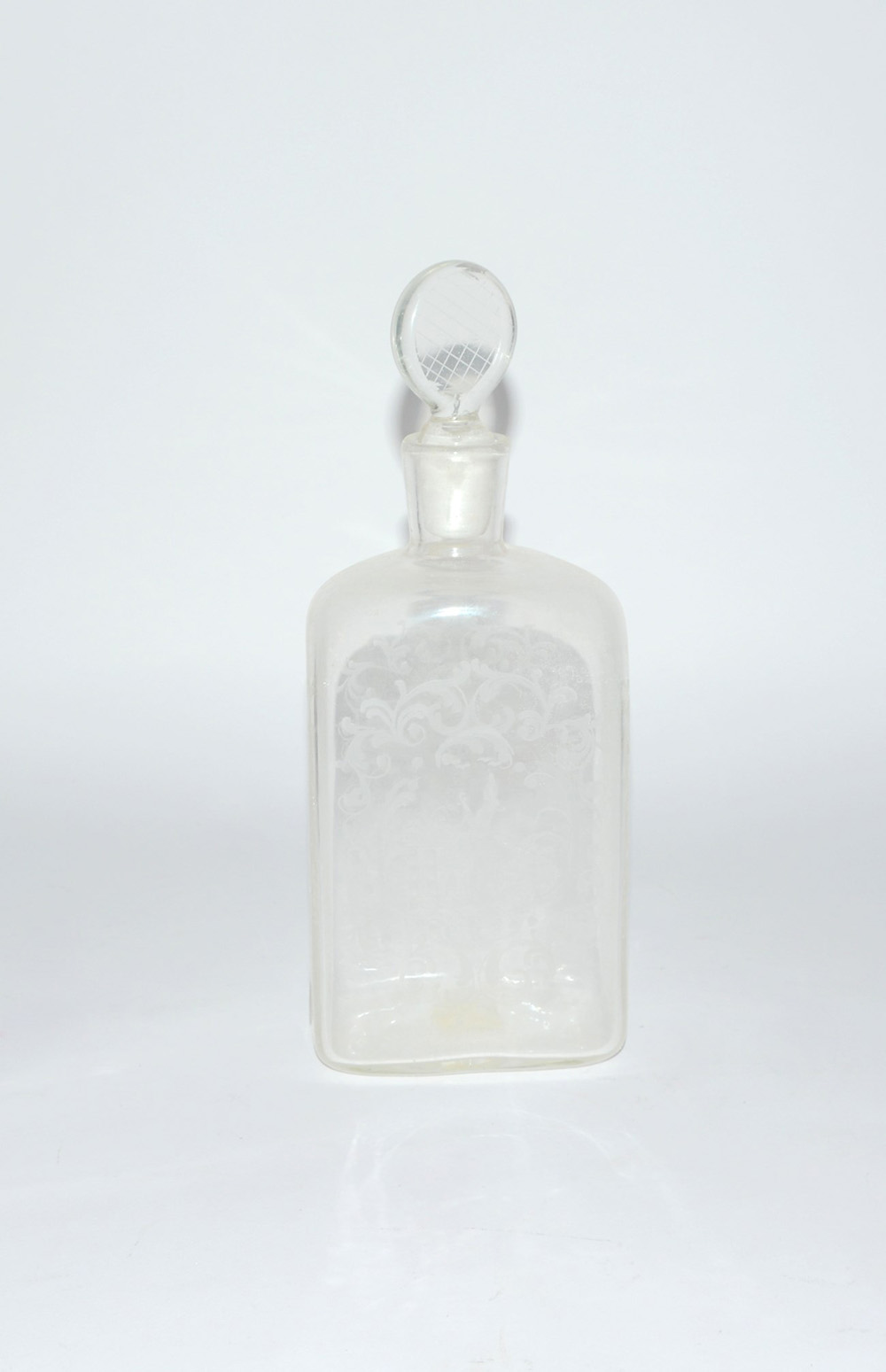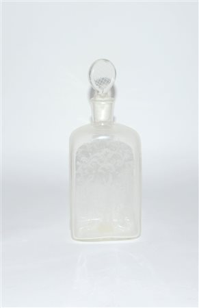 Manifattura di Murano sec. XIX. Bottiglia con tappo di forma squadrata con corpo inciso a figure entro volute fogliate (h. cm 30)