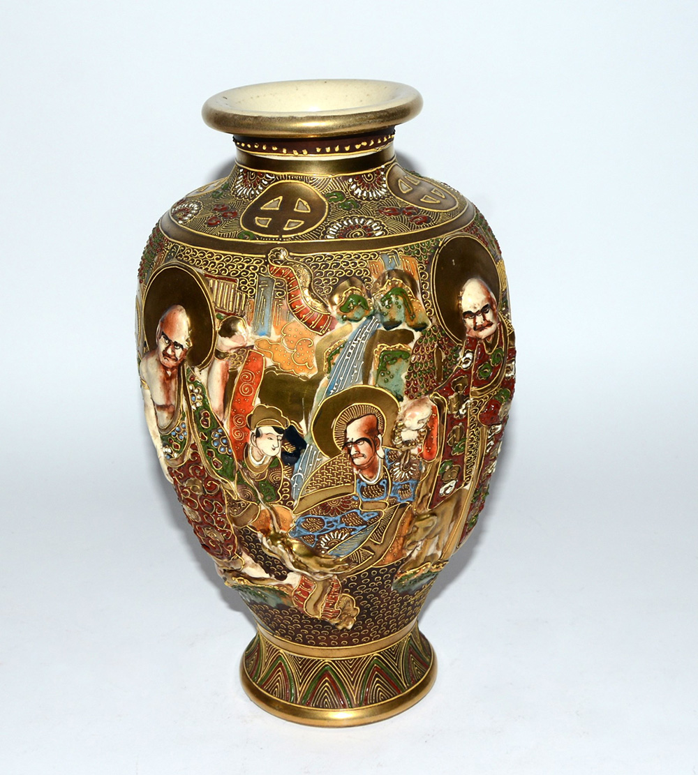 Manifattura giapponese inizio sec. XX. Vaso in ceramica decorato in policromia su fondo dorato e scene di vita in rilievo (h. cm 29)