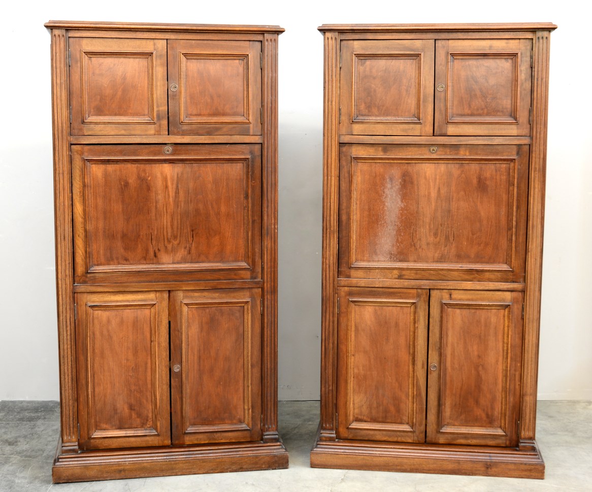 Coppia di credenze a cinque ante di cui quella centrale ribaltabile celante...