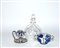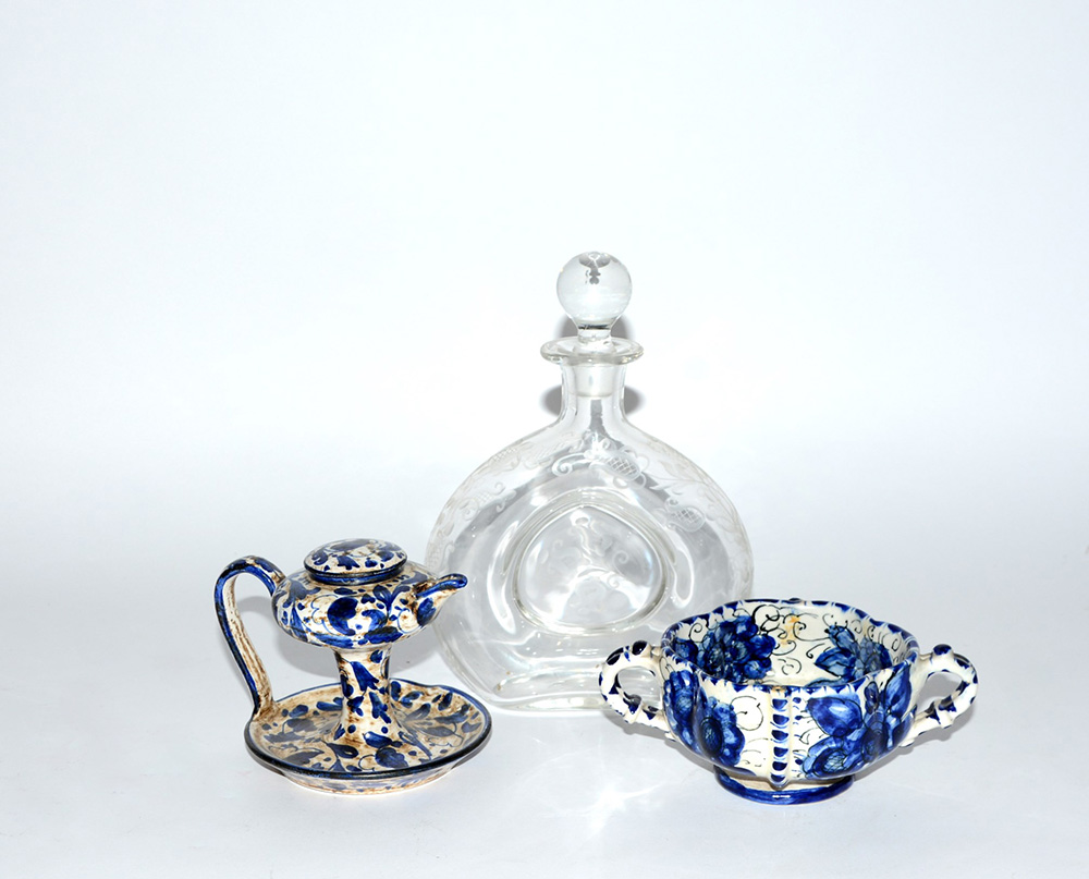 Lotto composto da una lucerna, una ciotola biansata della manifattura di Gubbio e una bottiglia in vetro inciso (difetti)