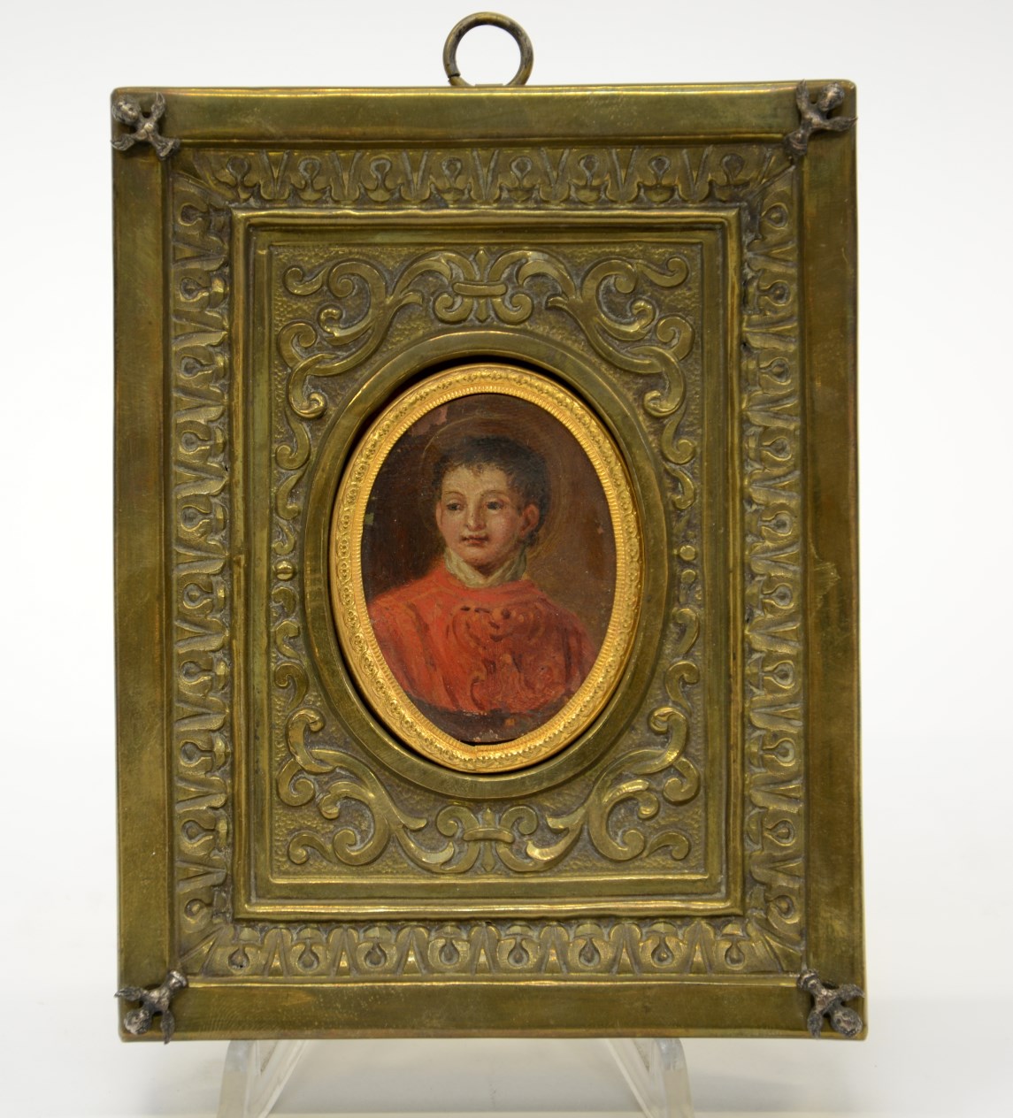 Arte del secolo XVIII - Santo Chirico miniatura ovale in cornice dorata inserita in cornice in metallo sbalzato del secondo XIX. (con cornice 12,5 x 16 cm)