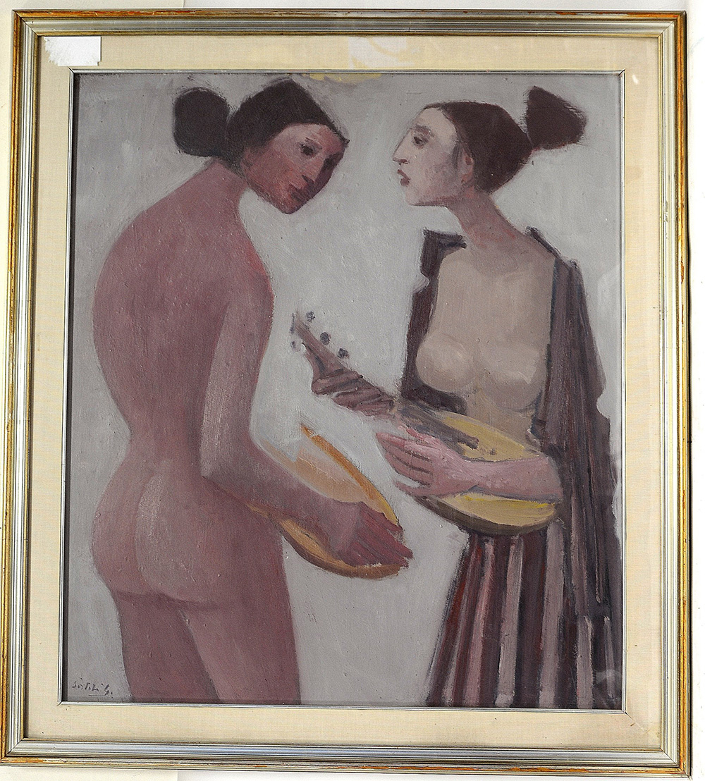 Firma indecifrata, "Donne con strumenti musicali", olio su masonite (cm 80x70) firmato in basso a sinistra, in cornice (lievi difetti)
