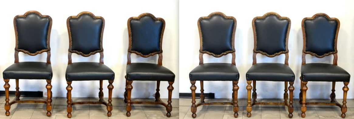 Lotto di sei sedie con gambe a rocchetto e spalliera sagomata, rivestiste in skai nera (lievi difetti)
