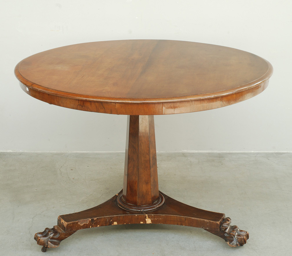 Tavolo di forma circolare poggiante su gamba centrale squadadrata con piedi ferini intagliati.(d cm 105x74)(difetti e mancanze)