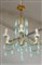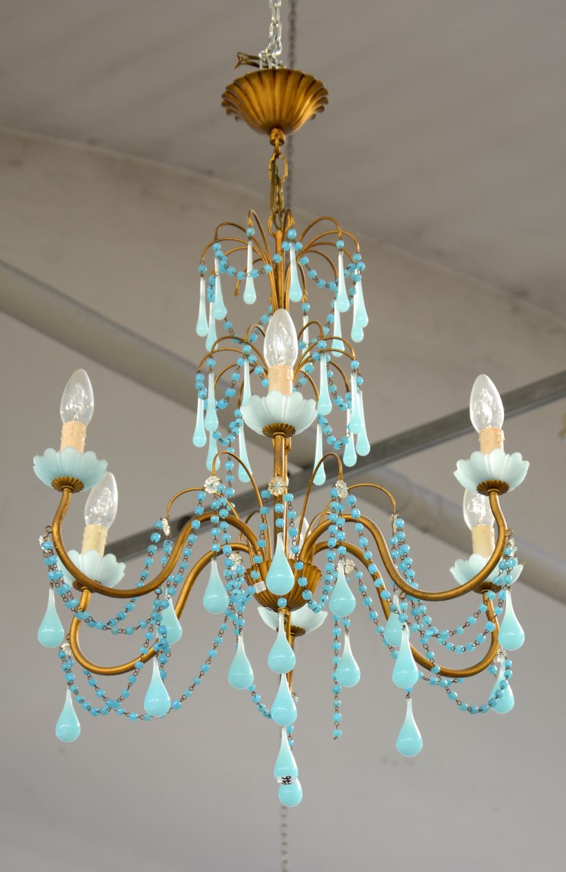 Lampadario a sei luci con struttura in metallo dorato decorato con perline azzurre (h cm 75 )lievi difetti)