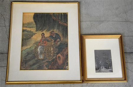 Lotto composto da un dipinto su tessuto firmato Shen e da una stampa fotografica, misure diverse. In cornici