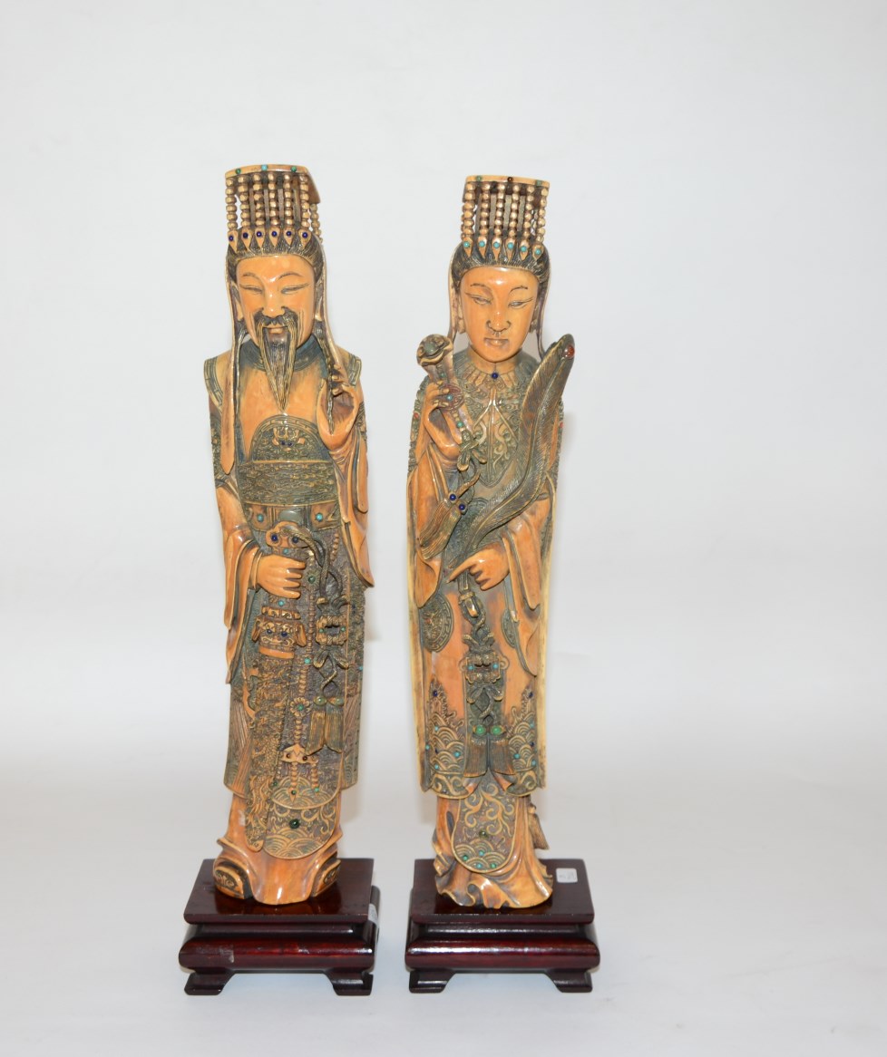 Lotto di due sculture in avorio raffigurati imperatore e imperatrice, basi in legno, Cina, sec. XX (h cm 35) (lievi difetti)