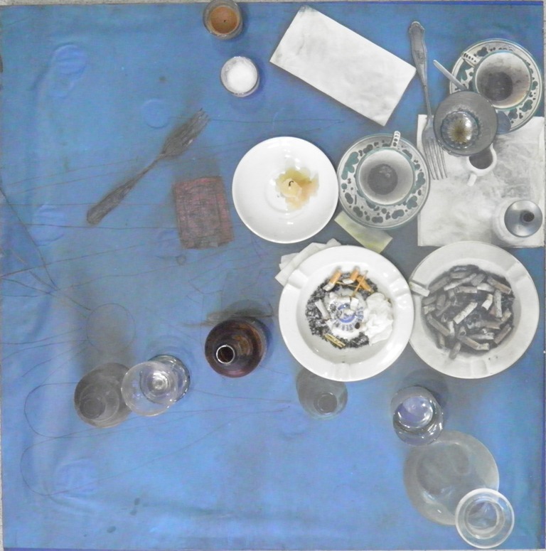 SPOERRI DANIEL ROMANIA 1930 TABLEAU PIEGE, 1972 TECNICA MISTA SU TAVOLA cm 70,5 x 70,5 Firma, anno e titolo sotto la base Etichette della Galleria l'Elefante (TV) e Galleria Maitre Binoche (Parigi)