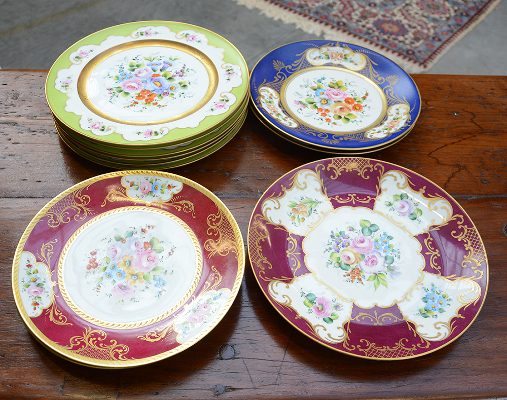 Manifattura tedesca, lotto composto da undici piatti decorativi in porcellana policroma decorati a motivi floreali nei toni del rosso, del blu e del verde (lievi difetti)
