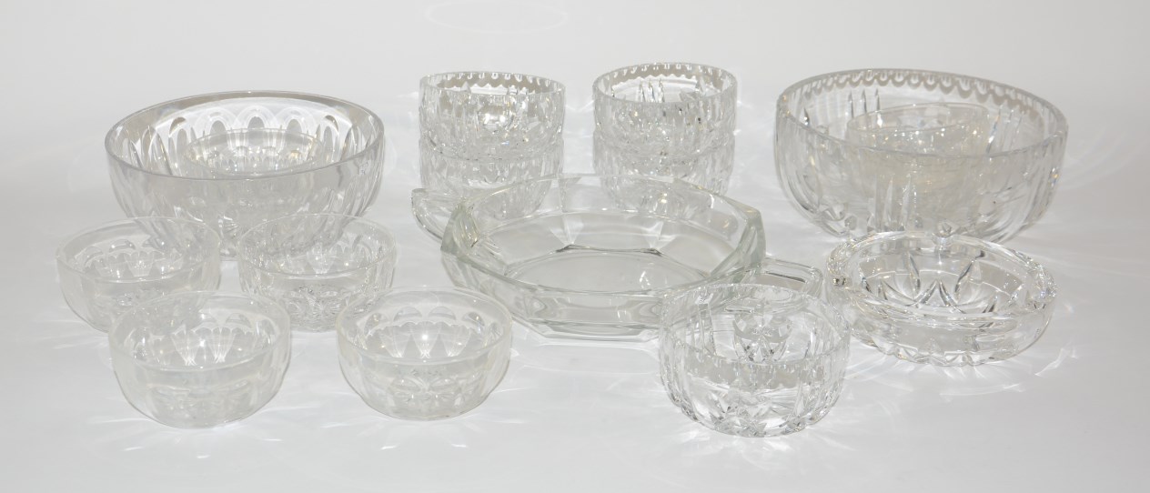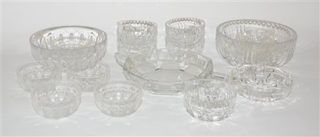 Lotto composto da tre ciotole, un posacenere e numerose coppette in vetro e cristallo molato (lievi difetti)