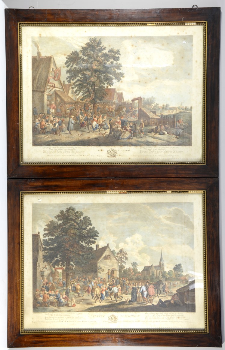 "Feste Fiamminghe" coppia di acquaforti a colori tratte dall' opera di David Teniers (cm 55x73) secolo XVIII. In cornici (difetti)