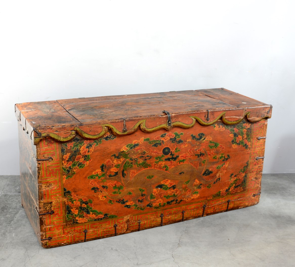 Baule tibetano in legno laccato con fronte decorato da figure di draghi e nuvole (cm 143x68x54). Cerniere ed elementi decorativi in ferro battuto (difetti)