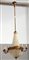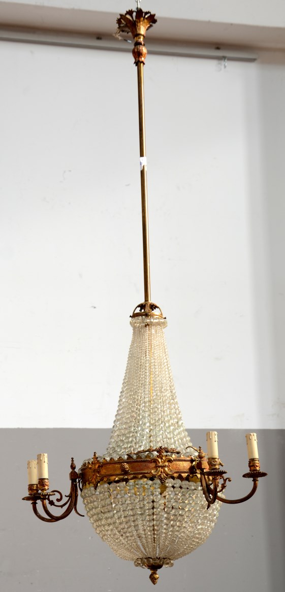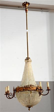 Lampadario a cesto a se luci con struttura in bronzo dorato e pendenti in vetro (h cm 150 circa)