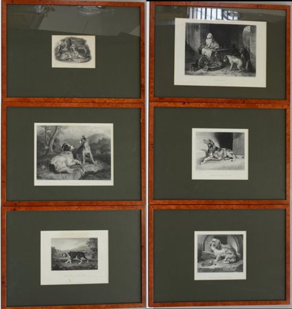 Gruppo di sei stampe inglesi raffiguranti cani, misure diverse. In cornici