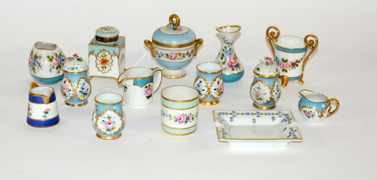 Lotto composto da numerosi modellini di suppellettili in porcellana policroma (lievi difetti)
