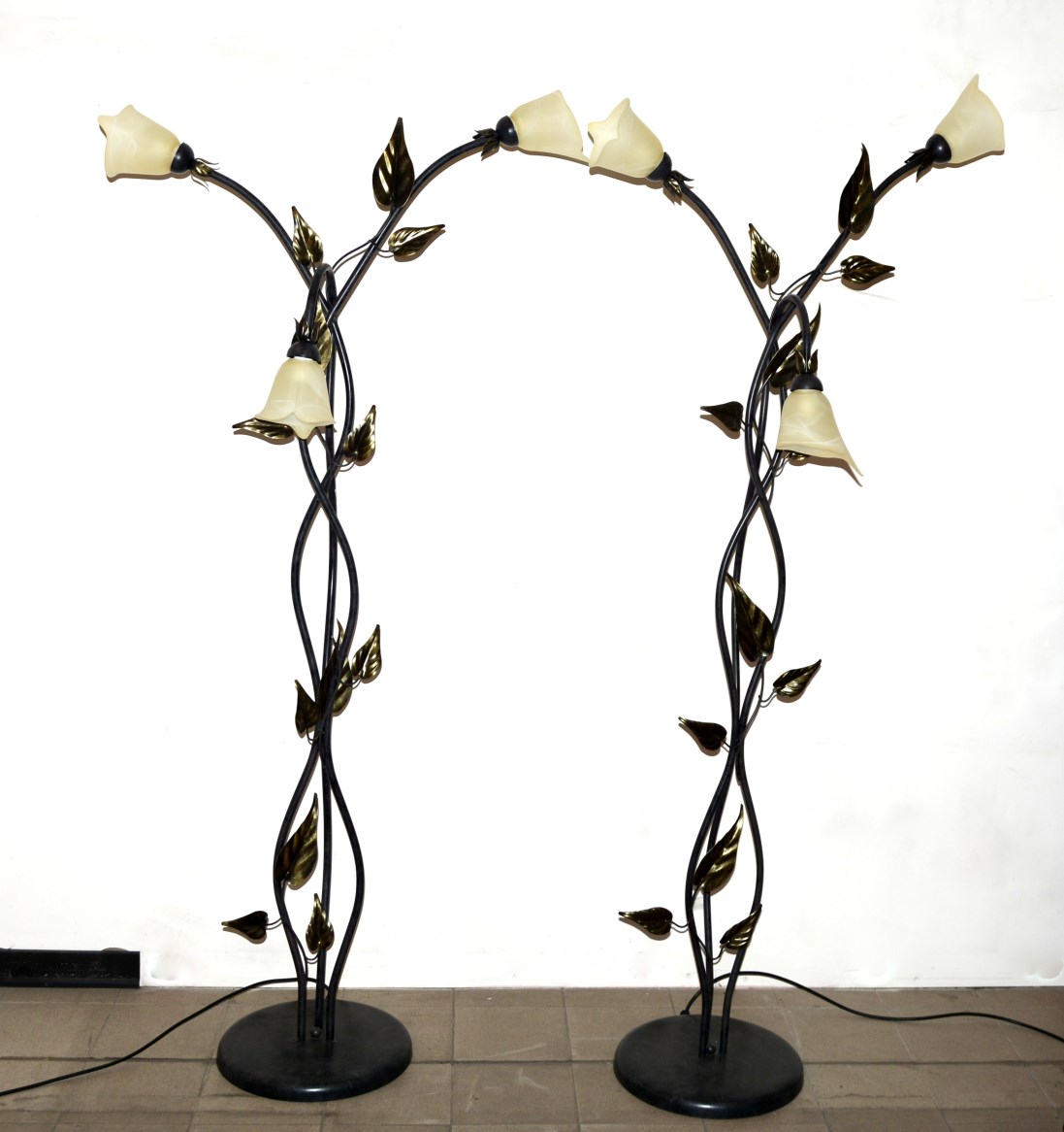 Coppia di piantane a tre luci con montanti a fusto intrecciato decorati con foglie in ferro battuto (h cm 157) (lievi difetti)