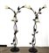 Coppia di piantane a tre luci con montanti a fusto intrecciato decorati con...
