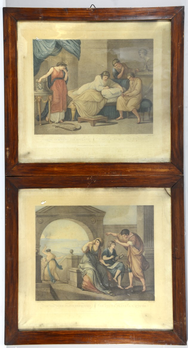 "Scene neoclassiche" coppia di antiche incisioni a colori tratte dall' opera di Angelica Kauffman (cm 53x57,5). In cornici (lievi difetti)