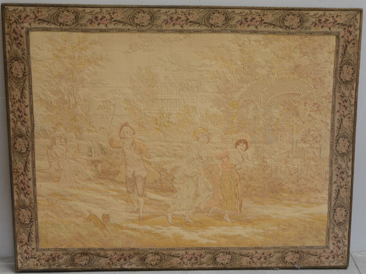 Ricamo a piccolo punto raffigurante scena di esterno con giochi di ragazzi alla maniera del secolo XVIII, dall' opera di Alonso Perez (cm 88x113) applicato su pannello (lievi difetti)