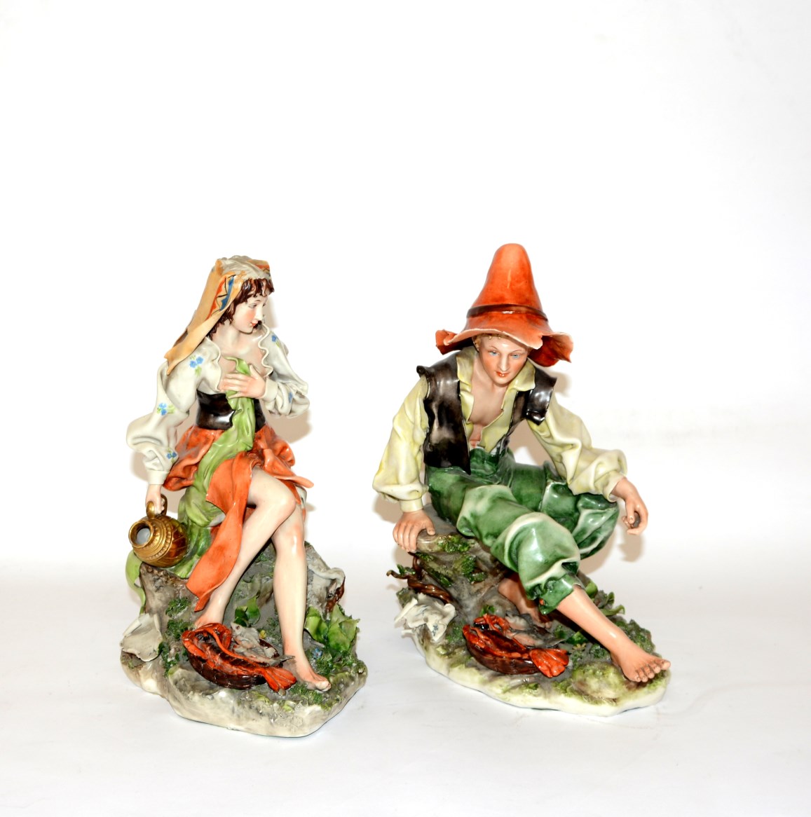 Lotto di due sculture in ceramica policroma raffiguranti due giovinetti sugli scogli (h cm 36 ca.) (difetti)