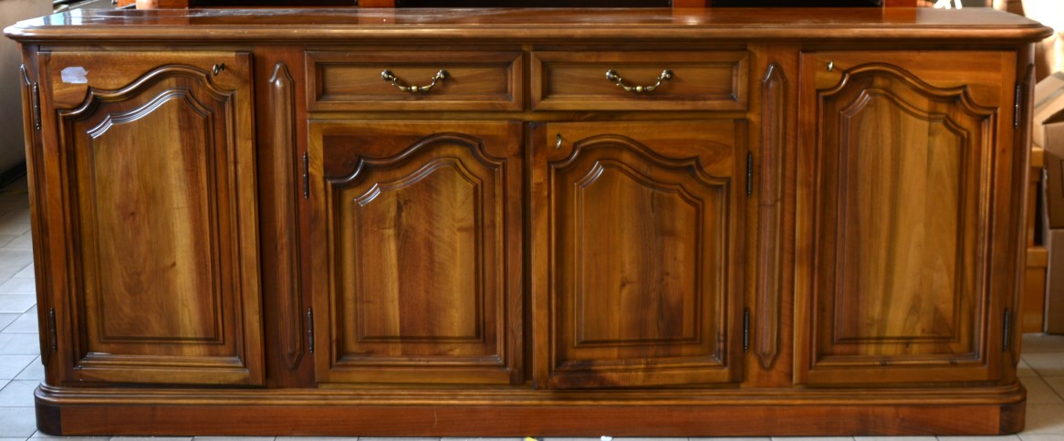 Credenza in legno dolce a quattro sportelli e due cassetti con pannelli riquadrati (cm 246x99x50) (lievi difetti)