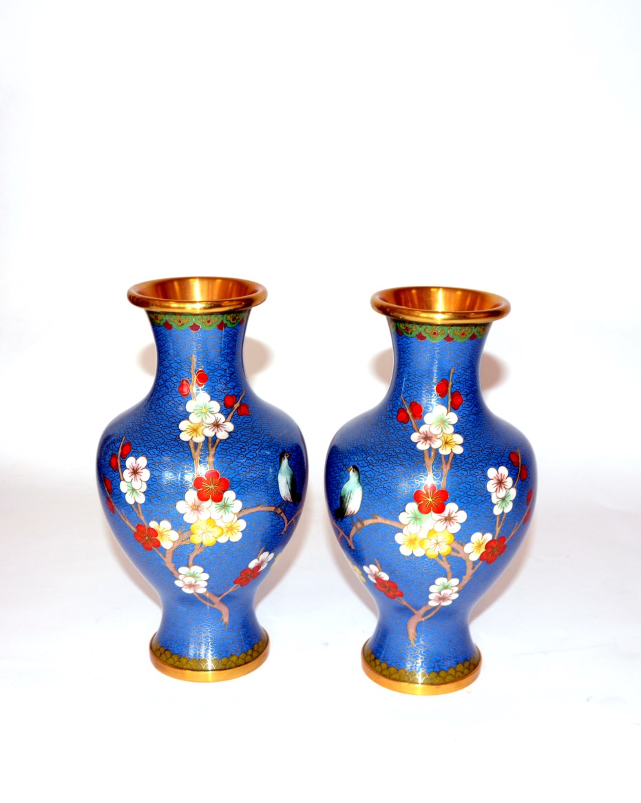 Coppia di vasi cloisonnÈ con decorazione floreale su fondo turchese, Cina, sec. XX (h cm 24)
