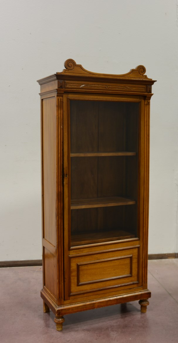 Vetrinetta in mogano ad un'anta a vetri sul fronte. Cimasa sagomata e intagliata. Piedin torniti. Inizio sec. XX (cm 70x165x34)