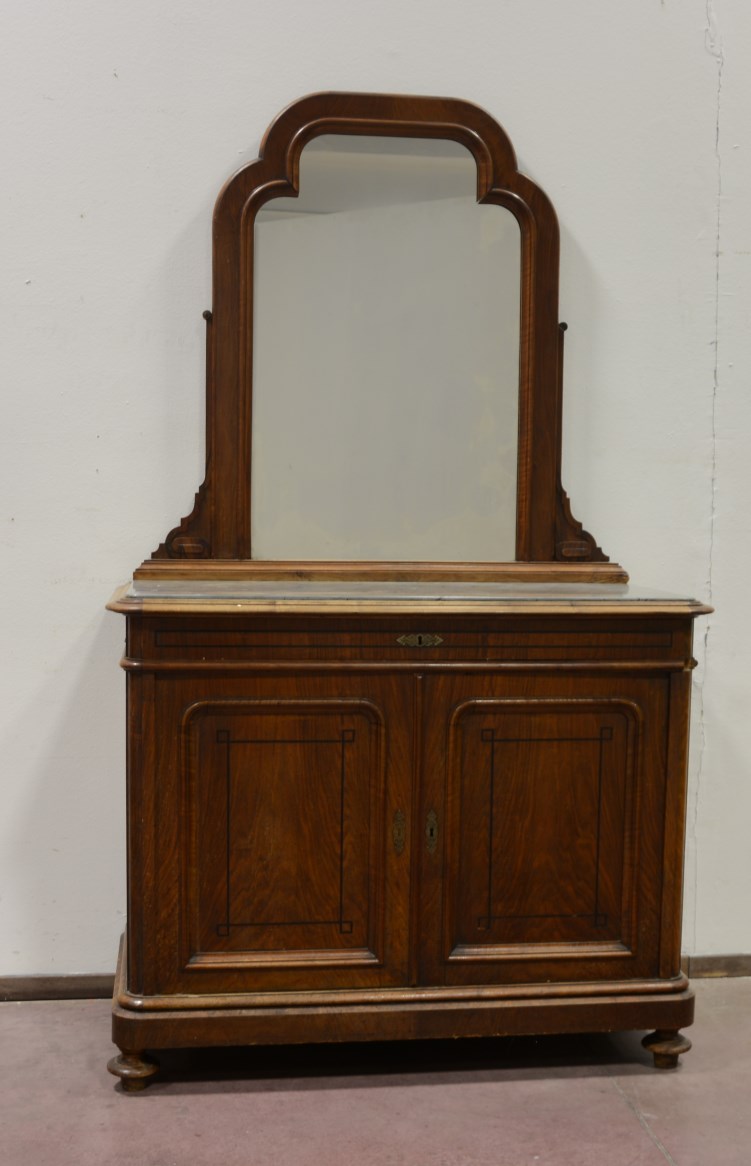 Credenza con alzata a specchio, parte inferiore ad un cassetto e due antine sul fronte. Piano in marmo (cm 123x210x62)(difetti)