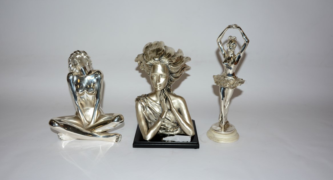 Lotto di tre sculture in metallo argentato raffiguranti personaggi femminili (lievi difetti)