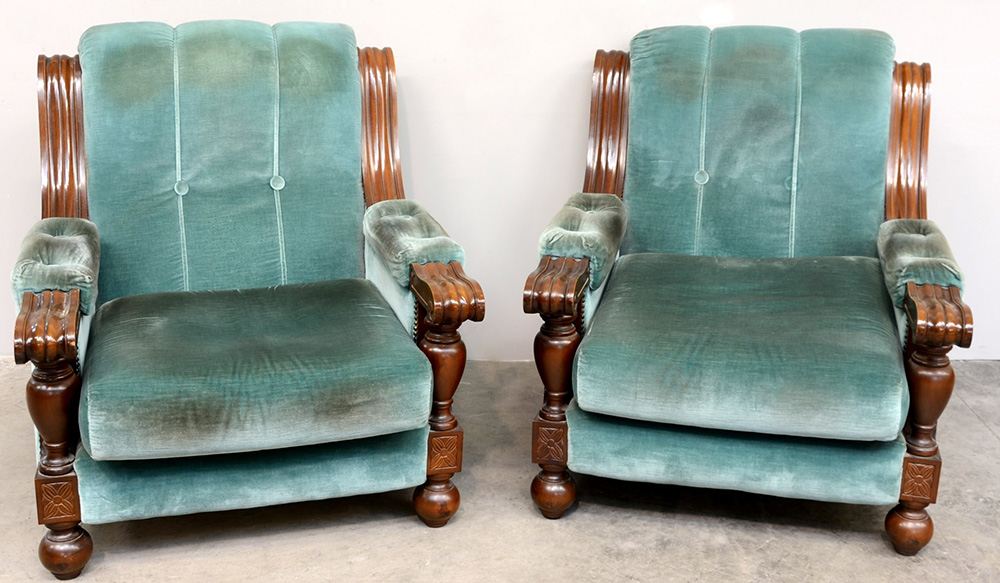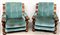 Coppia di poltrone con struttura in legno e rivestimento in velluto verde,...