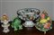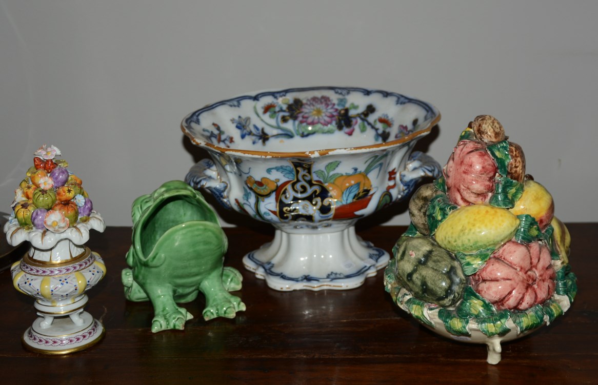Lotto composto da un centrotavola biansato, due composizioni con fiori e frutta e una rana in ceramica policroma (difetti)