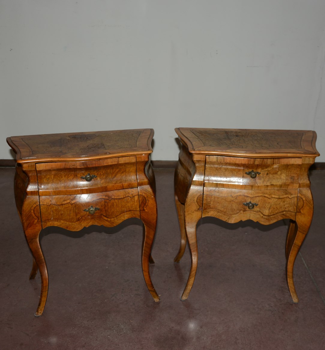 Coppia di comodini mossi lastronati in radica di noce a due cassetti sul fronte. Piedi mossi (cm 60x66x31)