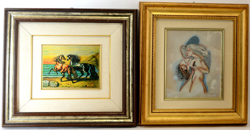 Lotto composto da due multipli, su lamina d'oro e d'argento, riproducenti le opere di De Chirico e Brindisi, misure differenti, in cornici (lievi difetti)