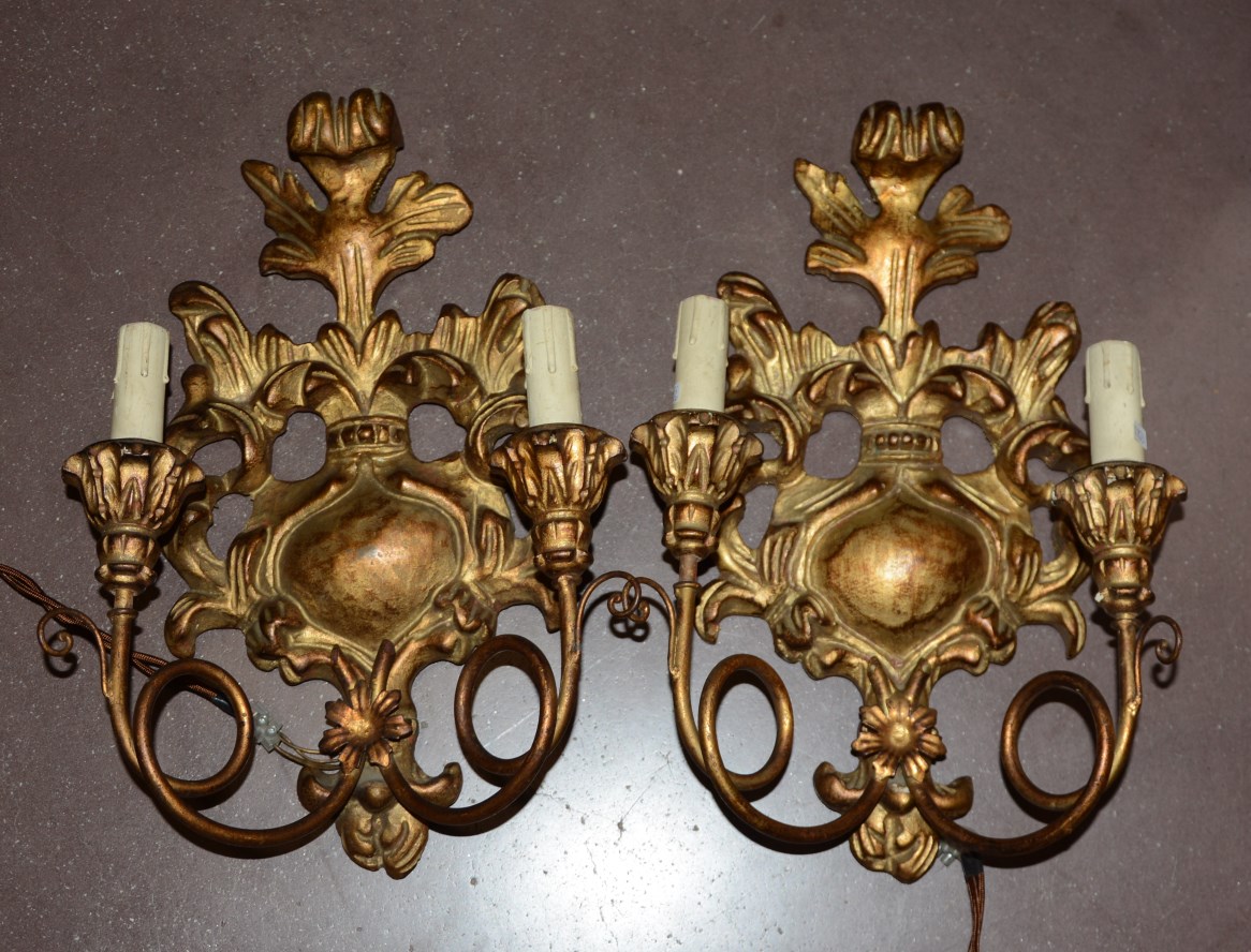 Coppia di appliques a due luci in legno intagliato e dorato