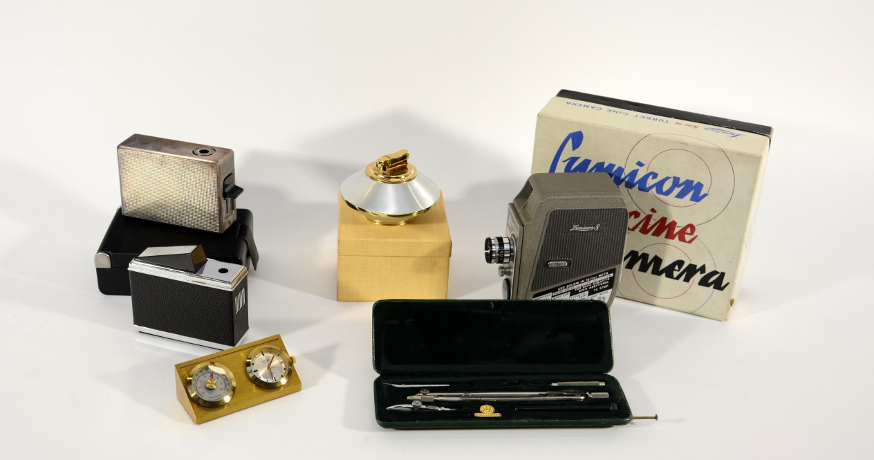 Lotto composto da una cinepresa, due accendini da tavola, un compasso, una...