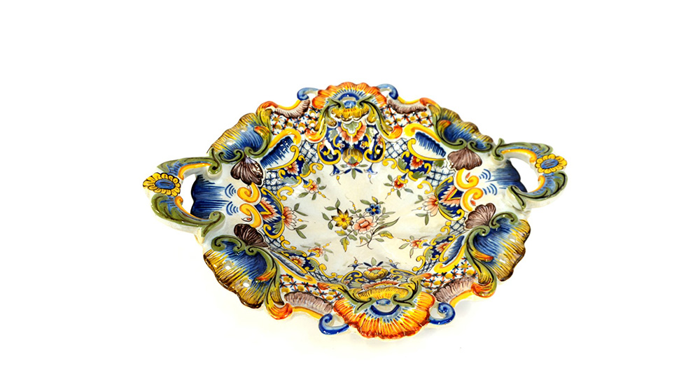 Manifattura francese. Centrotavola biansato decorato in policromia a fiori e...