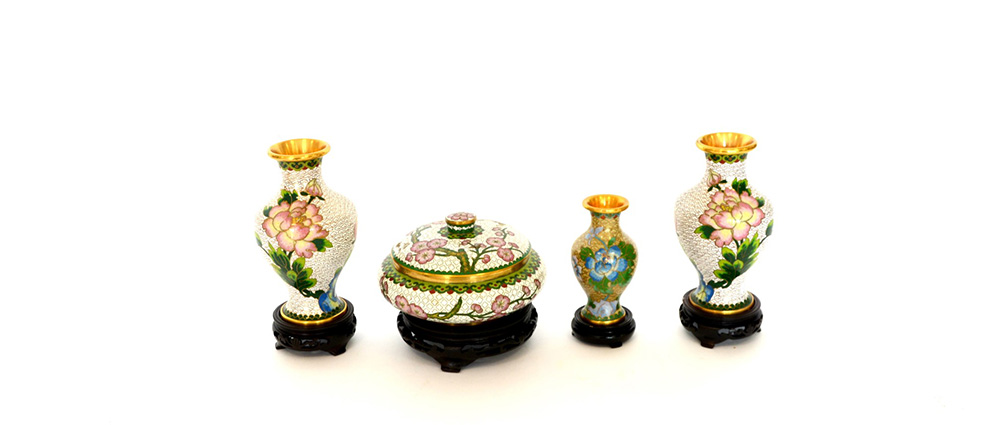 Lotto composto da tre vasetti in cloisonnÈ e una scatola con decorazione floreale, basi in legno, Cina, produzione recente (lievi difetti)