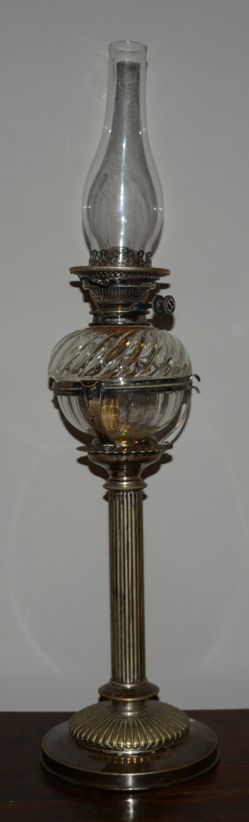 Lampada a petrolio in sheffield con fusto a colonna scanalata e boccia in vetro