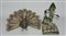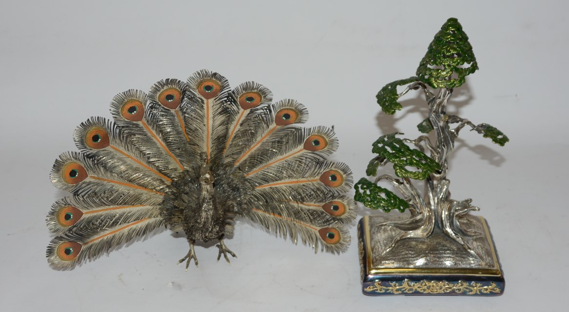 Lotto composto da due sculture in metallo argentato raffiguranti una bonsai e un pavone (lievi difetti)