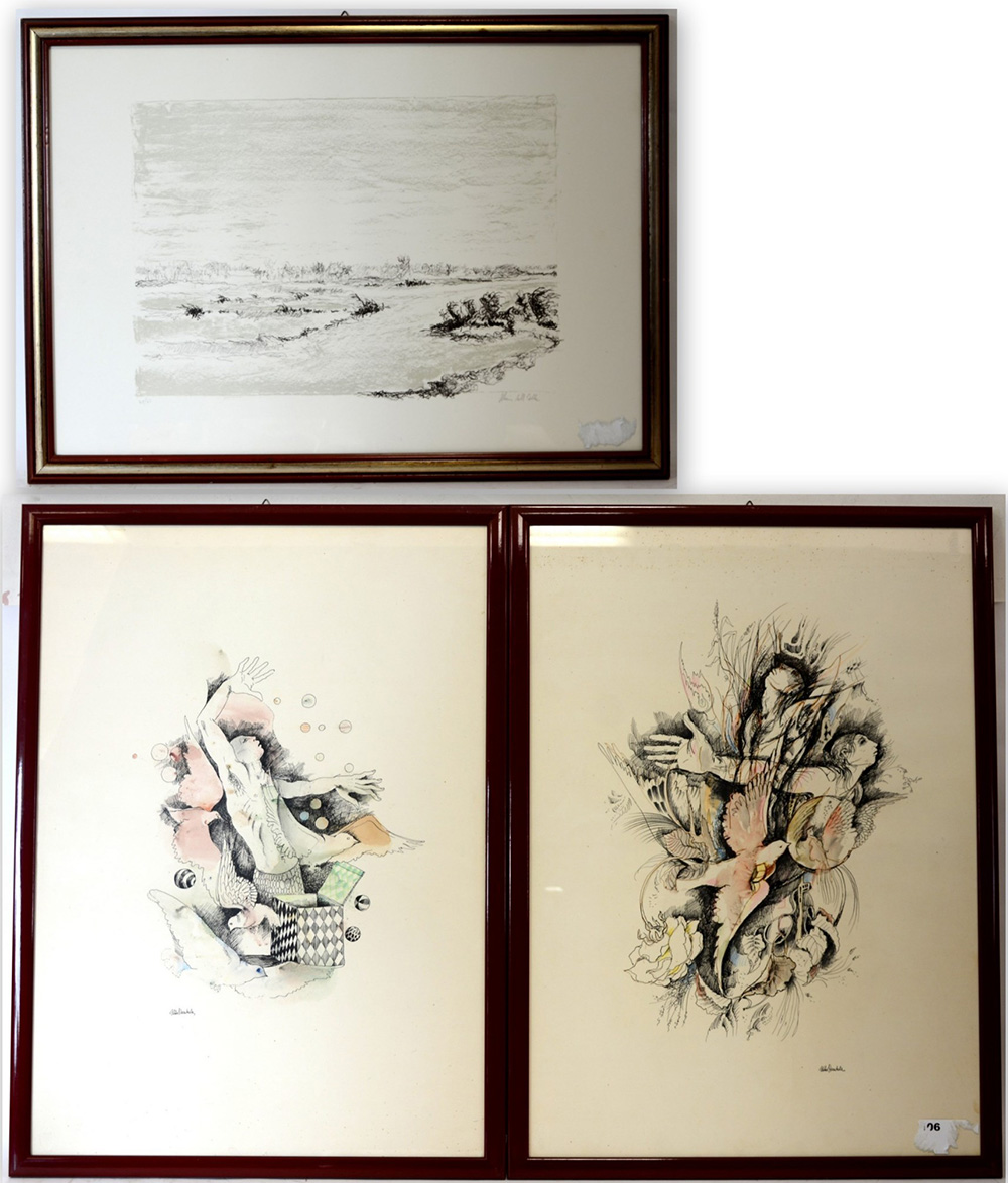 Lotto di tre litografie di autori differenti (cm 70x40), in cornici