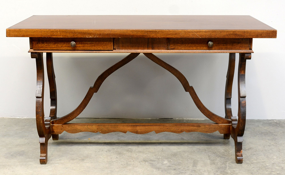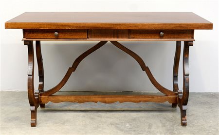 Tavolo in legno a due cassetti sottopiano con gambe a lira riunite da traversa (cm 138x78x61) (lievi difetti)