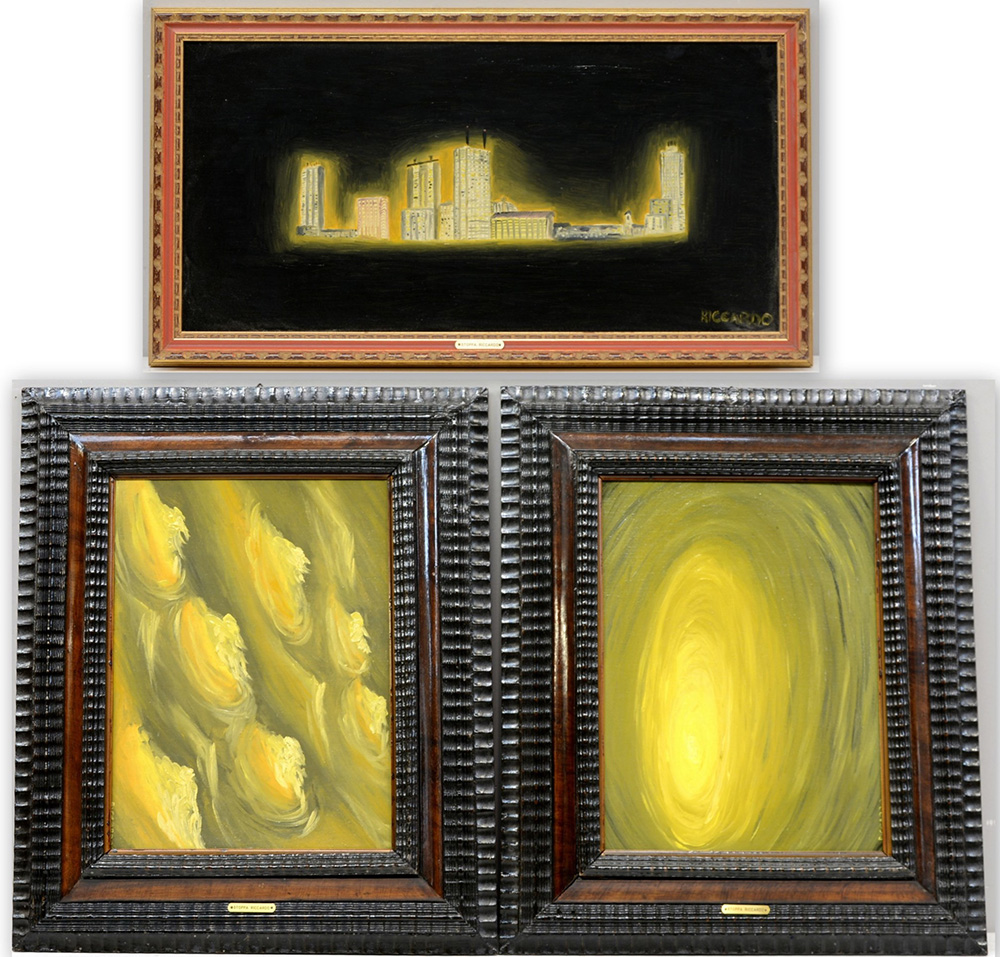 Riccardo Stoppa Lotto di tre dipinti ad olio raffiguranti un paesaggio urbano e due composizioni, misure differenti, in cornici (difetti)
