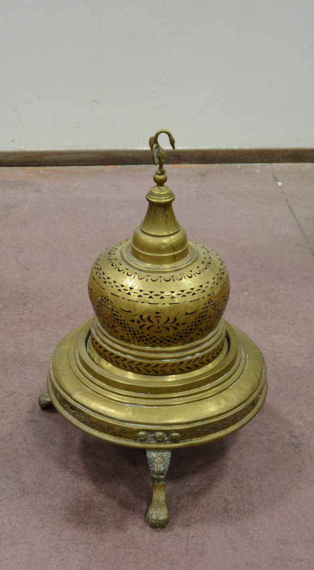 Braciere in ottone con coperchio decorato da figura di cigno e piedini a zampa fierina
