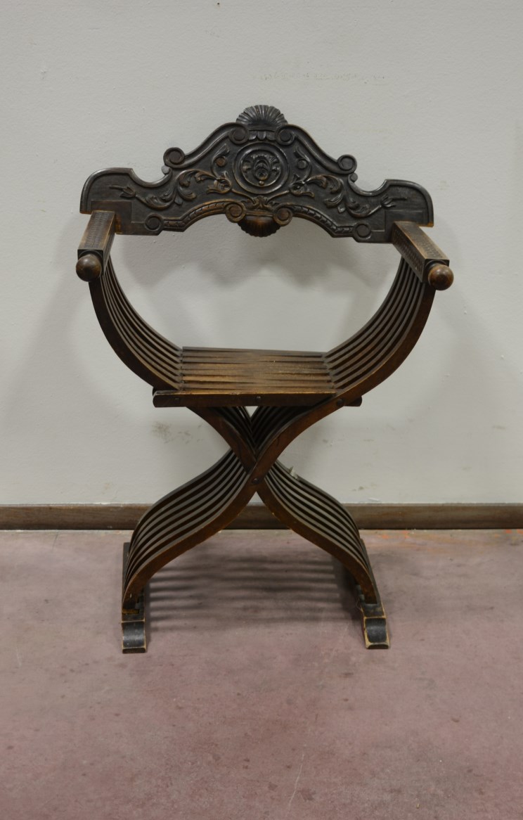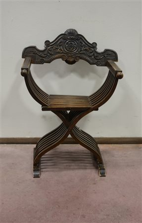Poltrona savonarola con schienale sagomato e intagliato (difetti)
